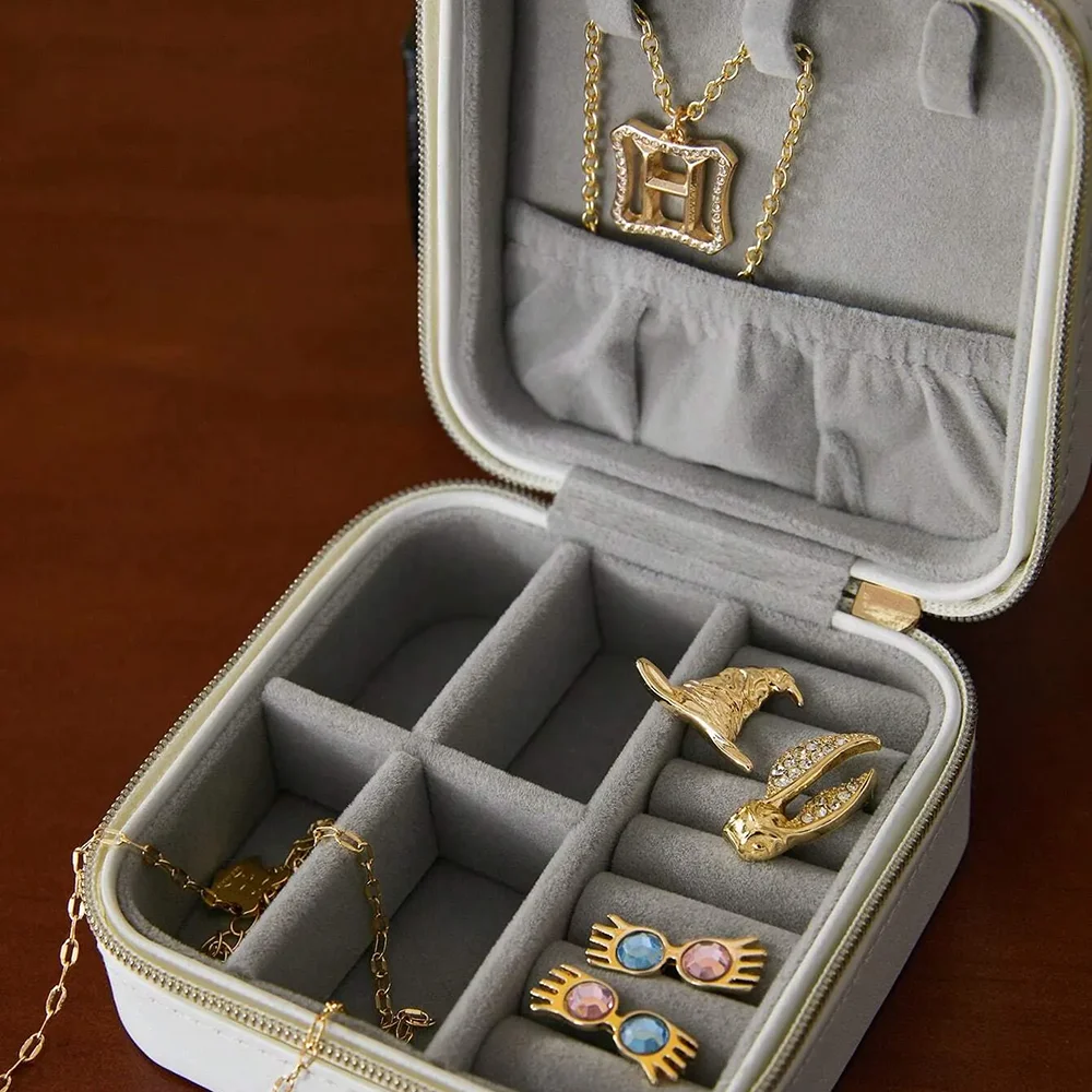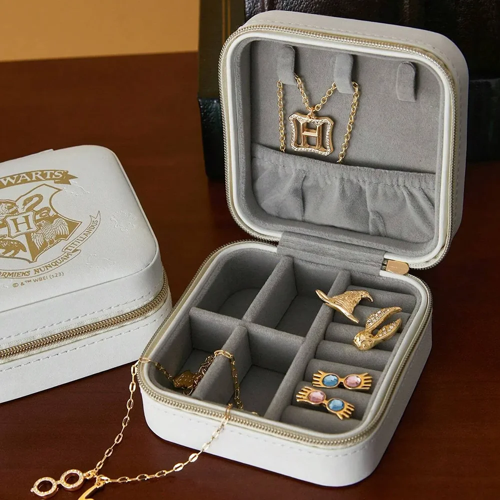 Organiza tus joyas con esta elegante caja inspirada en Harry Potter, decorada con el escudo de hogwarts. Su diseño compacto y funcional incluye compartimentos internos forrados en terciopelo suave, ideales para proteger y ordenar tus accesorios. Perfecta para los fanáticos del mundo mágico que buscan un toque de sofisticación en su colección.