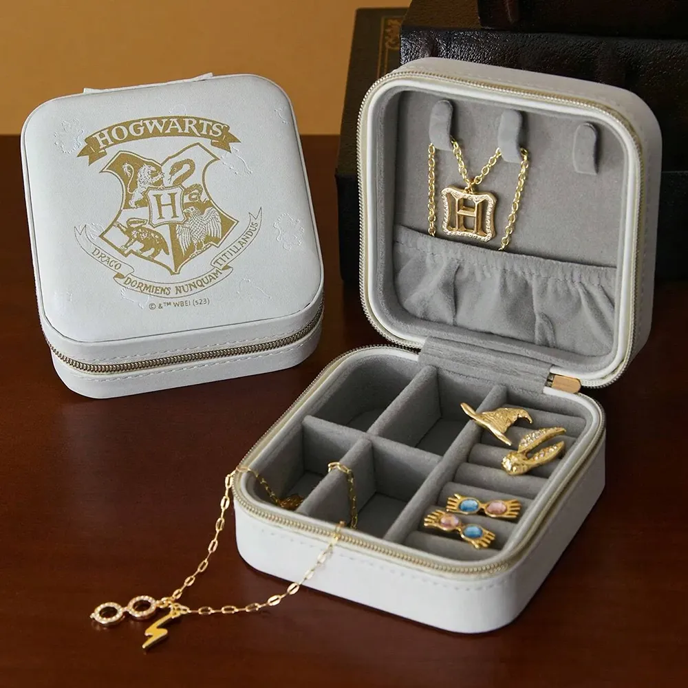 Caja de joyas inspirada en Harry Potter con diseño del escudo de hogwarts, perfecta para guardar tus accesorios mágicos.