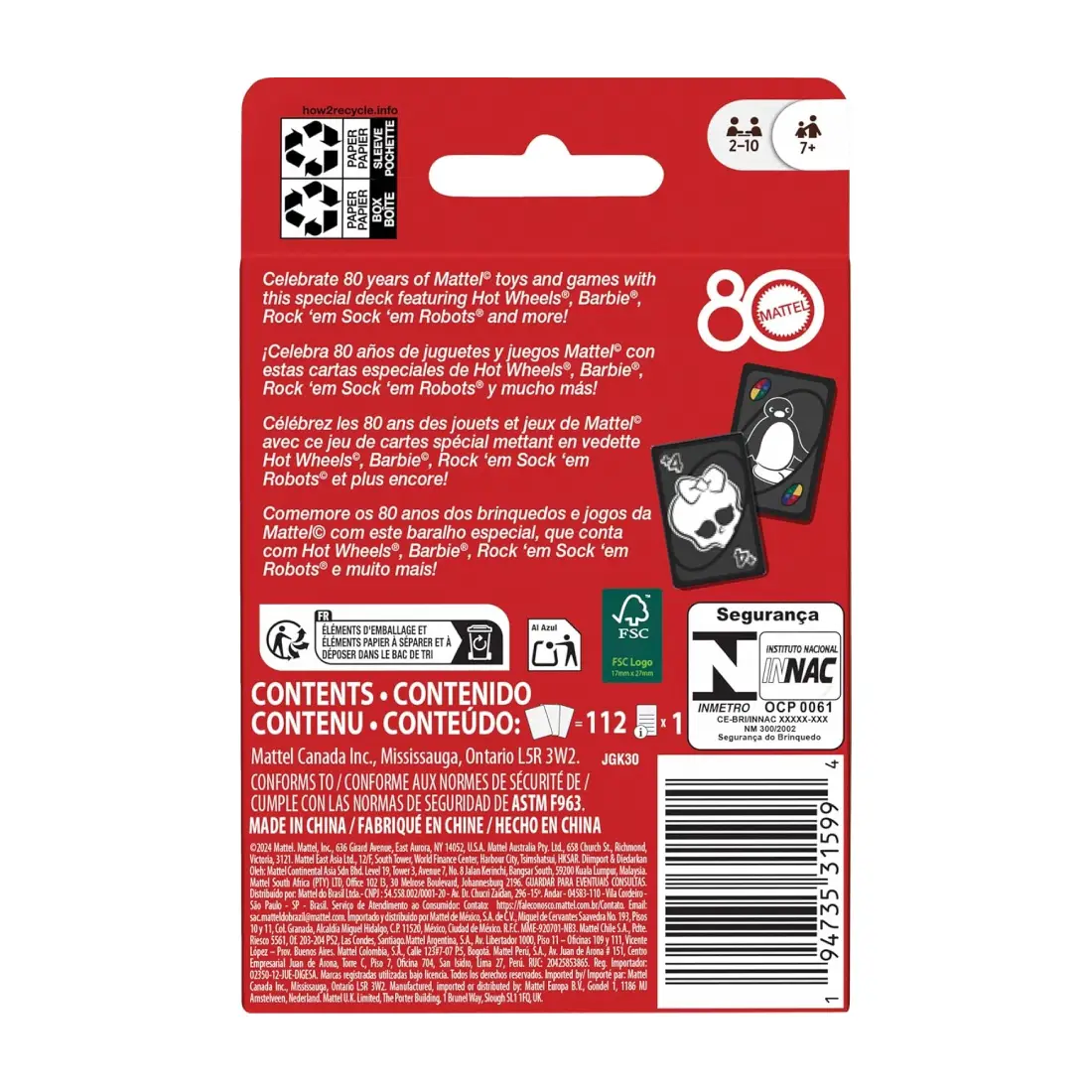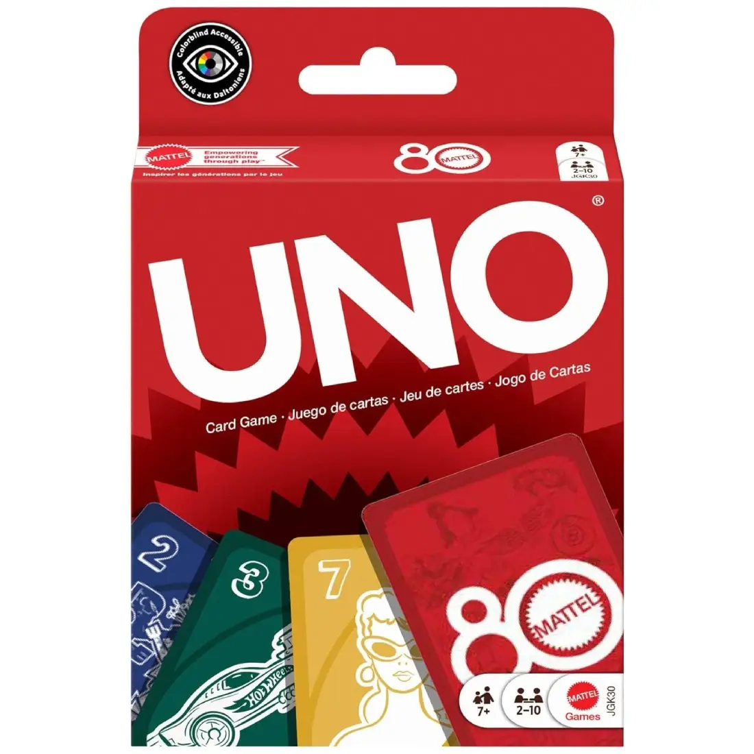 ¡Celebrá 80 años de diversión con esta edición especial del clásico juego de cartas UNO! La versión 80 Aniversario presenta un diseño único y elegante que rinde homenaje a la historia de Mattel, manteniendo las reglas originales que todos amamos. Perfecto para reuniones familiares, noches de juegos con amigos o para coleccionistas que quieran tener una pieza conmemorativa en su estantería.