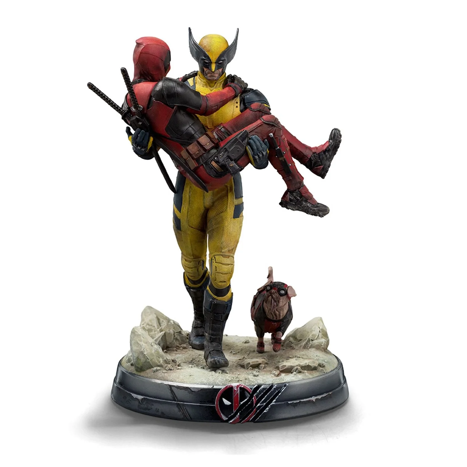 En un decorado de campo de batalla, el conocido miembro de los X-Men héroe mutante con esqueleto y garras recubiertas del indestructible metal llamado Adamantium, en un gesto de aparente compañerismo y altruismo, carga cordial y amablemente con el locuaz mercenario y azote de Chimichangas, aparentemente herido en combate. Caminando sobre una base rocosa, formada por piedras y sedimentos calcáreos, y acompañado por la versión canina de su aliado de otro universo, aparece por primera vez en live action con su clásico traje amarillo, azul y negro en versión táctica, llevando en brazos al impredecible y algo desquiciado comediante carmesí. Inspirada en una de las películas más esperadas del año, Iron Studios presenta con orgullo «Deadpool y Lobezno – Deadpool y Lobezno Película – Deluxe Art Scale 1/10», directamente desde el multiverso Marvel, una espectacular estatua aprobada por el control de calidad «Pool».