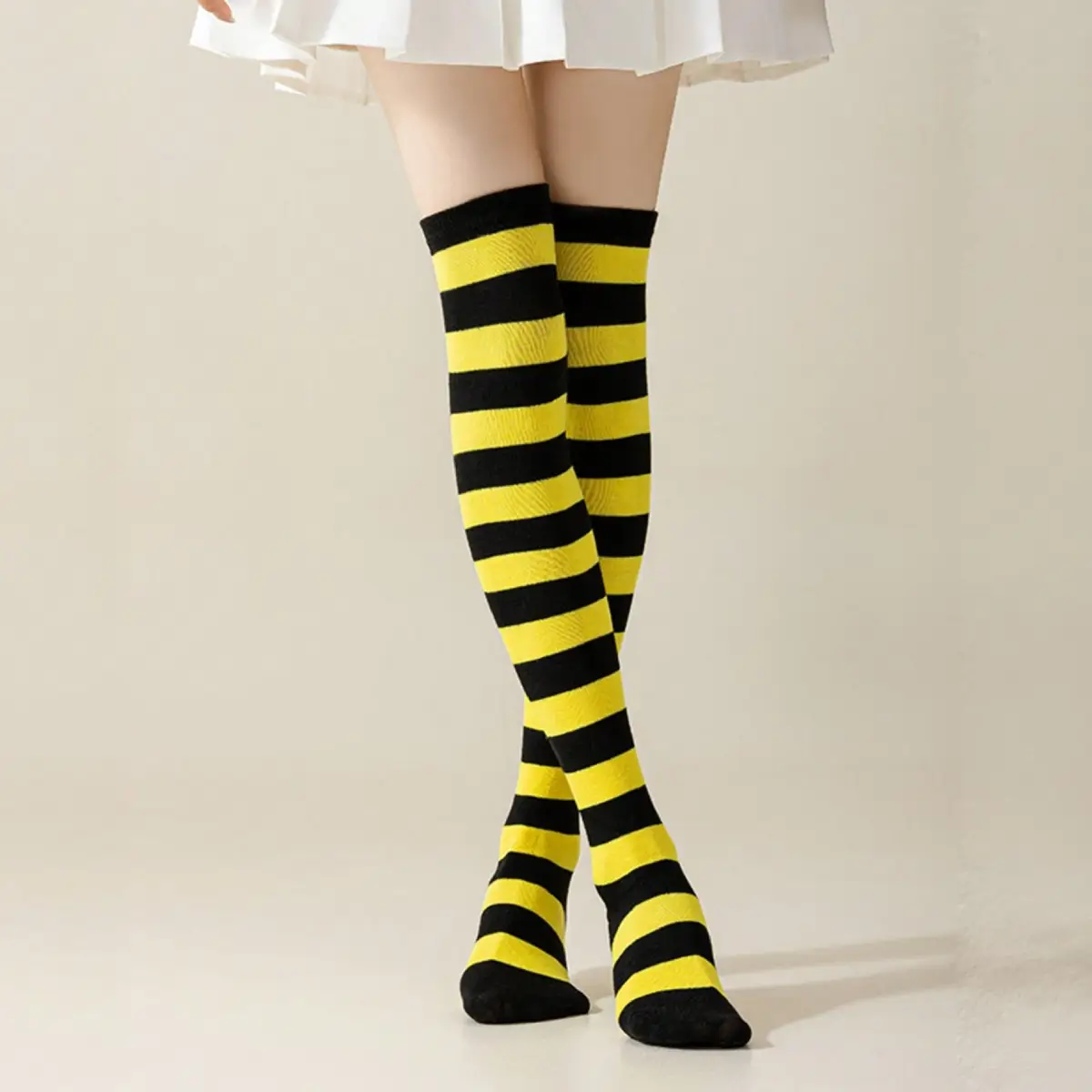 ¿quién dijo que las medias no pueden ser protagonistas? Estas bucaneras a rayas negro y amarillo no solo te abrigan, ¡sino que también te roban miradas! Con onda vintage y un toque rebelde, son perfectas para looks coquetos, cosplay estilo lou clark o simplemente para sacar tu lado más buzz buzz sin miedo. Combinalas con una falda, un vestido o lo que se te antoje. Lo importante es que te diviertas usándolas tanto como nosotras al verlas.