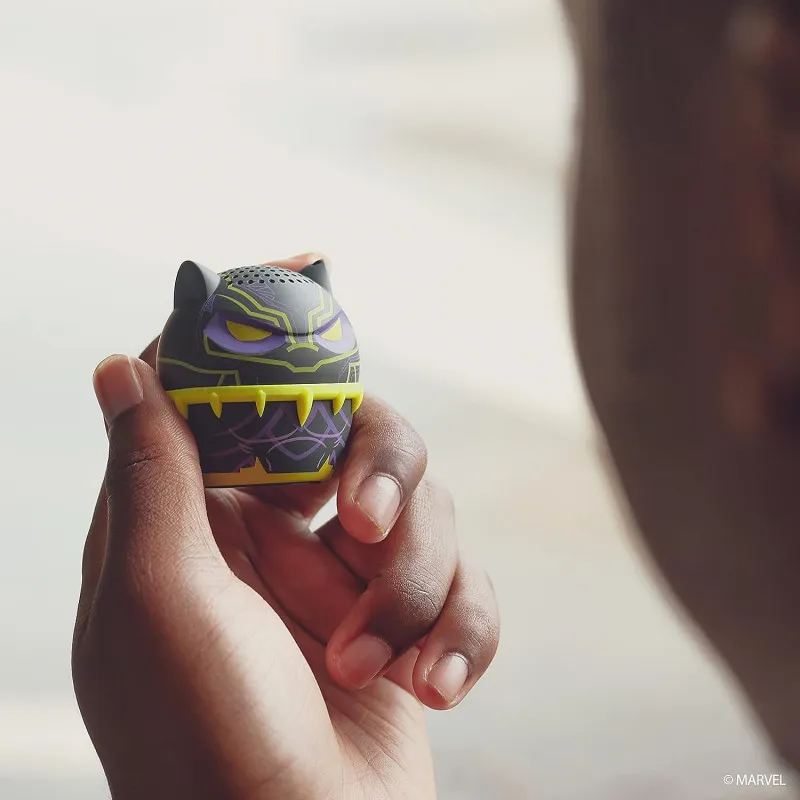 Ilumina la noche con tu lista de reproducción favorita y un toque de color. ¡Enciende una luz negra sobre este Bitty Boomer de Black Panther y sorpréndete con el efecto de resplandor brillante!